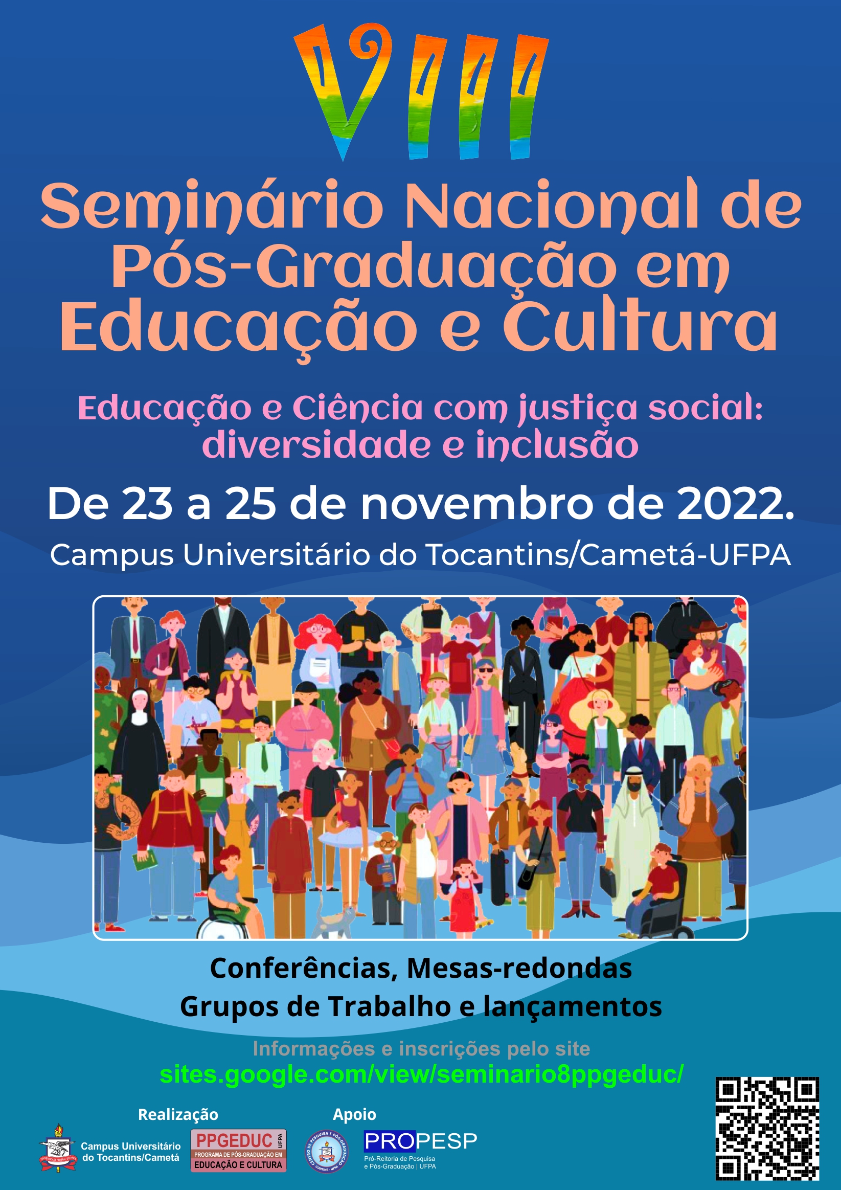 O VIII Seminário Nacional de Pós-Graduação em Educação e Cultura, Campus Universitário do Tocantins/Cametá da Universidade Federal do Pará, tem como tema: “Educação e Ciência com justiça social: diversidade e inclusão” que ocorrerá de 23 a 25 de novembro de 2022, e tem como objetivo reunir pesquisadores e educadores brasileiros e estrangeiros para dialogarem sobre as relações entre Educação e Ciência, considerando a perspectiva da justiça social. Visite o site do evento.